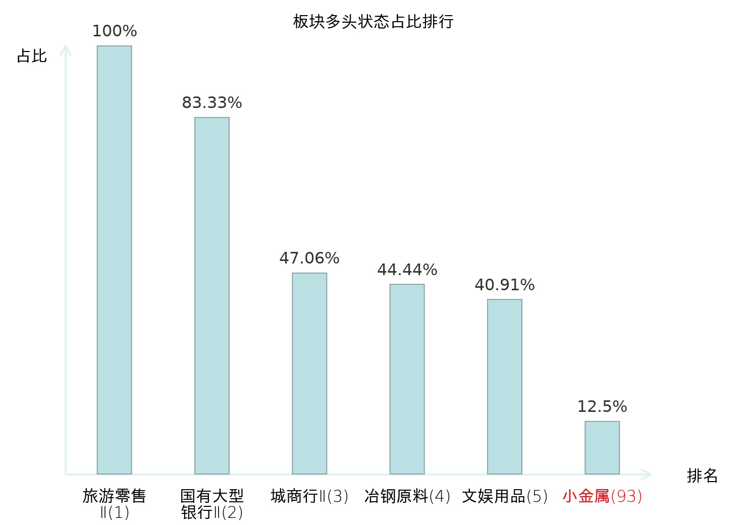 全市场所有行业板块中主力多头状态占比排名中,旅游零售Ⅱ板块位居第一。旅游零售Ⅱ板块名次提升最快,较昨日上升130位。