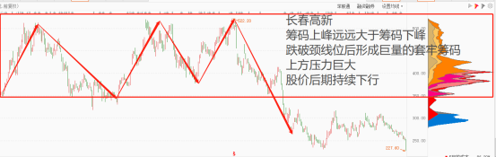 (3) 筹触发上峰>下峰之后的条件之后,如果有K线顶部反转形态的配合会加强见顶的信号,如果出现了跳空缺口跌破筹码峰则资金的态度更坚决,比如案例2的长春高新出现了一个三重顶信号的加强,配合筹码峰被深度套牢可以更好的认为个股短期已经完成筑顶之后进入了调整期。