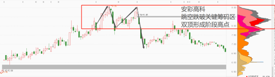 比如下图图例4的安彩高科在2021年6月到8月在高位构筑了一个双重顶形态,伴随着一根跳空跌停把上方筹码区全部跌破,形成高位筹码全部套牢,形成阶段高点。