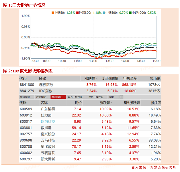 今日4大指数全天在水下运行,阴线收盘,午间气氛到达冰点后,尾盘有所回升,量能较昨日持平,资金在题材中不断腾挪,十分活跃。数据中心IDC概念全天强势,概念股依米康、鹏博士、宁波建工、广东榕泰、佳力图、中国软件、浩丰科技、任子行等涨停,天夏智慧涨逾6%。