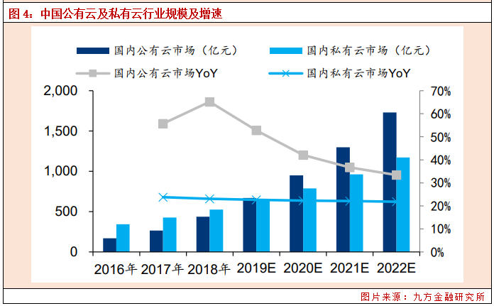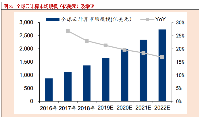 IDC作为云计算的基础设施有望受益于云计算行业的增长。根据中国信通院2019年发布的《云计算发展白皮书》预测,2020~2022年全球云计算市场将保持16%以上的增速,同期国内公有云市场讲保持33%以上的增速,私有云市场将保持20%以上的增速,高于全球增速。