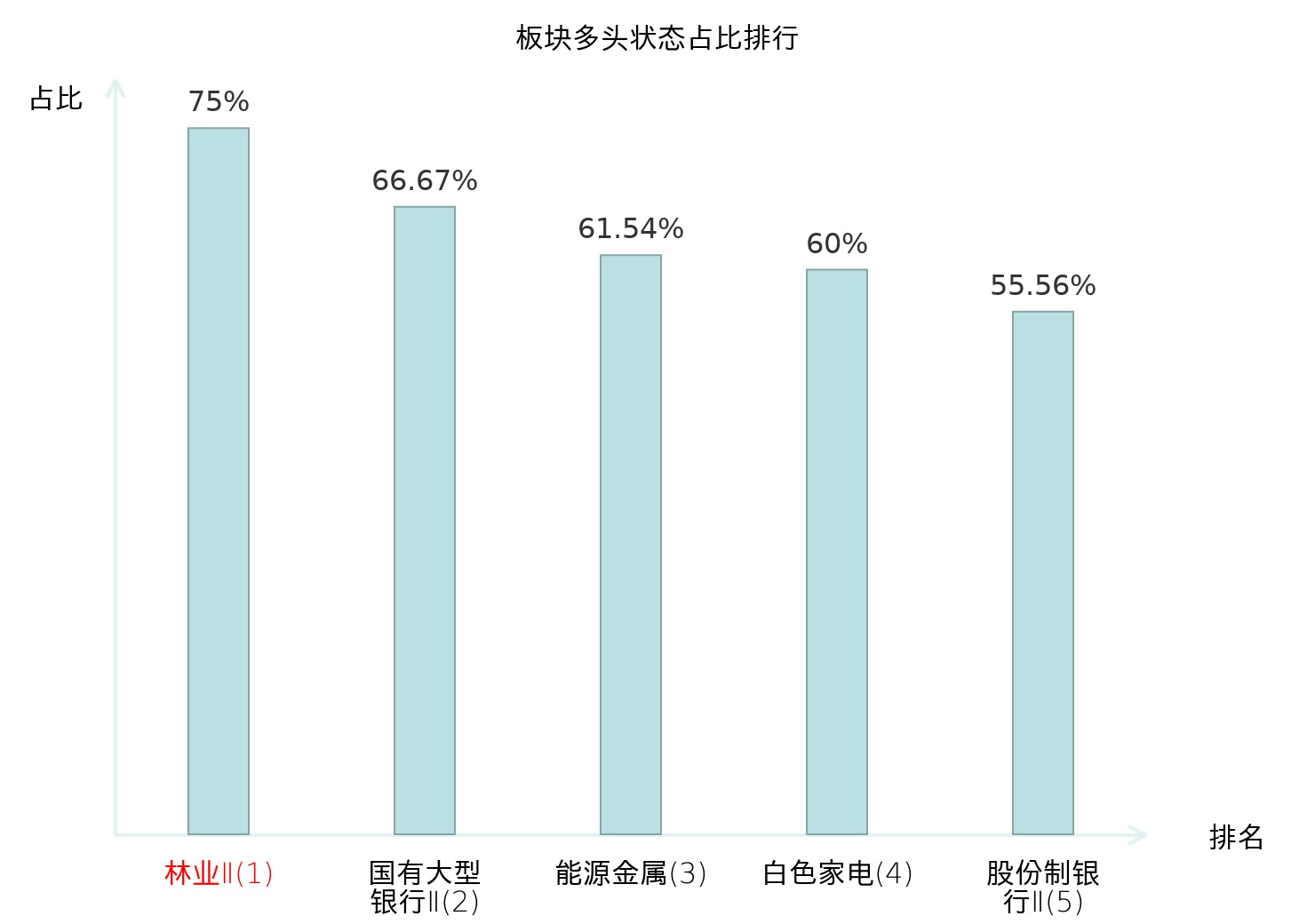 全市场所有行业板块中主力多头状态占比排名中,林业Ⅱ板块位居第一。数字媒体板块名次提升最快,较昨日上升48位。
