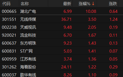 上证报中国证券网讯 10月22日早盘,广播电视板块活跃,截至9时59分,湖北广电涨停,走出2连板,无线传媒涨超3%,天威视讯、东方明珠、江苏有线等跟涨。