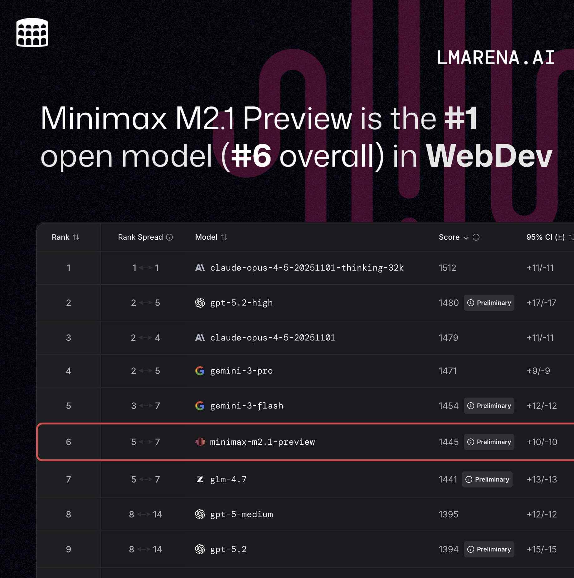 近日,在 LMARENA.AI 的 WebDev 榜单中,MiniMax M2.1 Preview 跻身全球第四名(前三名为Anthropic、OpenAI及Google)、中国第一。不仅如此,传奇程序员、Web开发框架Ruby on Rails之父DHH在X上对MiniMax M2.1给予高度评价,称其处理复杂代码库时展现出了令人印象深刻的高效能力。