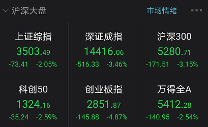 3月4日,A股三大指数大幅下挫,沪指跌2.05%报3503.49点,深成指跌3.46%报14416.06点,创业板指跌4.87%报2851.87点。白酒、医疗、多晶硅、生物疫苗、化工原料等板块跌幅居前,石油、钢铁、煤炭的、电力等板块则逆市上涨。