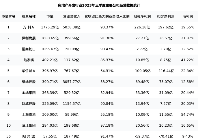 阳光城最新报告期数据为三季度,下表汇总了房地产开发行业内市值靠前的公司三季度主要经营数据