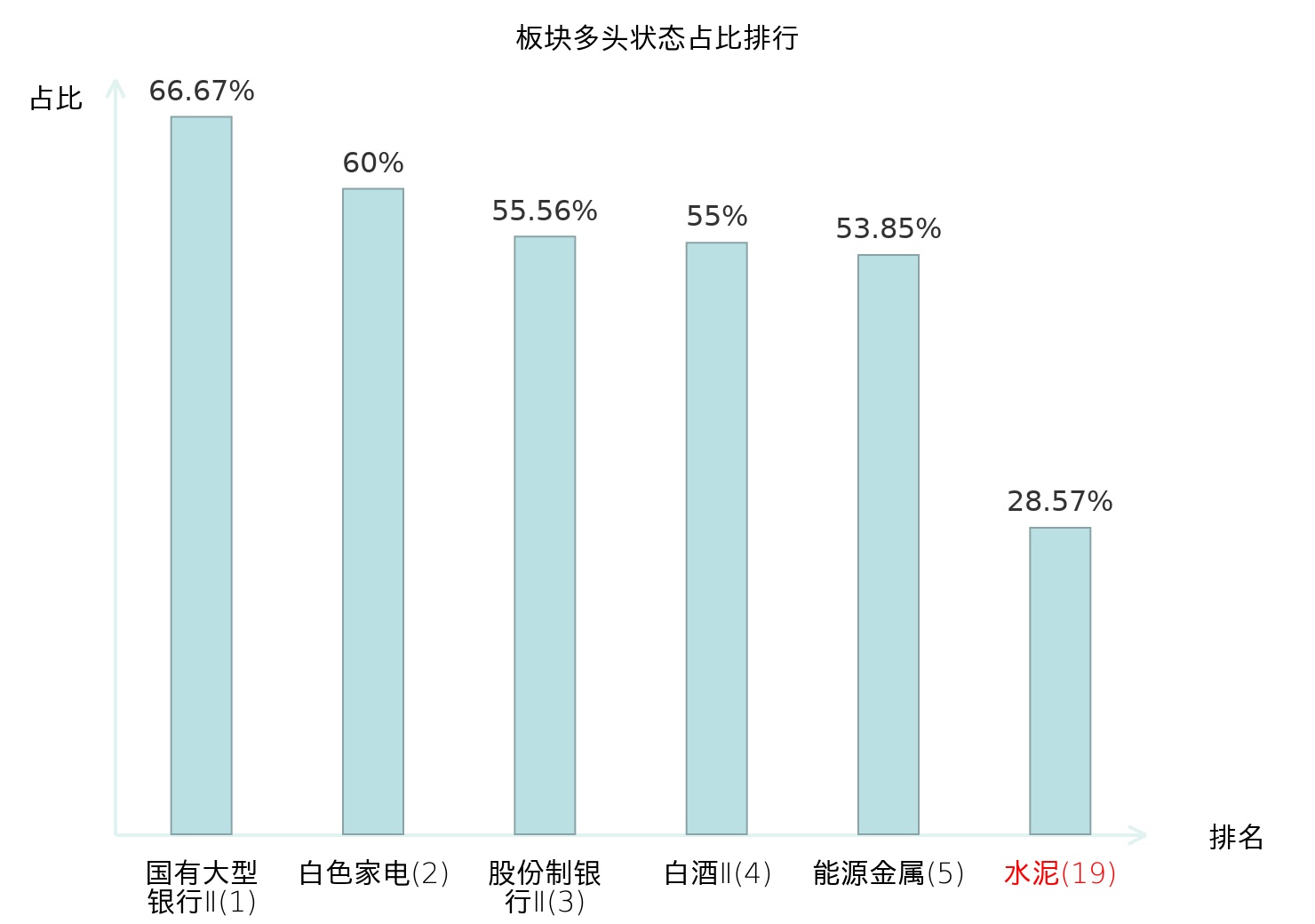 全市场所有行业板块中主力多头状态占比排名中,国有大型银行Ⅱ板块位居第一。林业Ⅱ板块名次提升最快,较昨日上升99位。