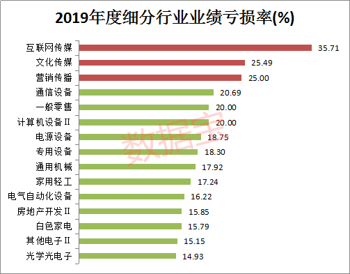 以2019年度发布业绩亏损股占比来看(预告股以预告中值来计算),传媒板块亏损率接近30%,位居行业首位,其次的综合及休闲服务行业亏损率分别为25.93%及25%。细分板块方面,超过30股的行业中,互联网传媒、文化传媒及营销传媒的业绩亏损率位居前三,且均位于25%以上。