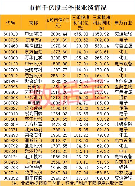 27只市值千亿的股票披露了三季报业绩数据,接近一半的股票净利润翻倍增长,中远海控、京东方A、赣锋锂业净利润增幅排在前三位。