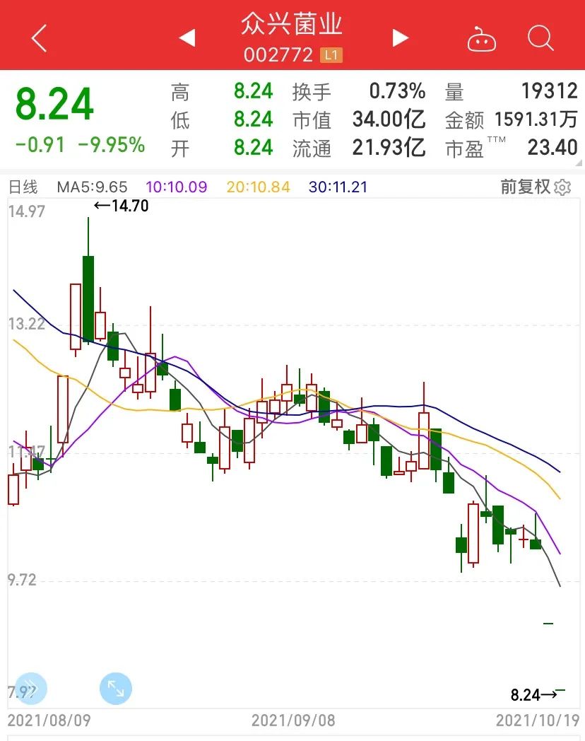 10月15日晚间,公司突然公告称,因市场宏观环境发生变化等原因,已于2021年8月25日决定终止本次收购。就这样,“金针菇大户”众兴菌业跨界卖酒告吹。众兴菌业三季报的业绩预告情况同样令人担忧,公司预计前三季度净利润亏损0.45亿元至0.55亿元,数据宝统计发现,公司2021年三季报业绩将创下上市以来首亏。近期的市场表现来看,投资者无疑用脚投票,从年内最高的17.24元/股,跌到8.24元/股,公司股价接近被打回大涨前的起点。