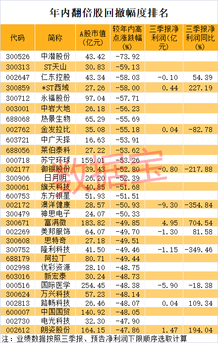 证券时报·数据宝统计显示,截至10月18日收盘,2021年最大涨幅翻倍的个股中,剔除年内上市新股之后,有138股较年内高点回撤40%以上。名单之中既有疫苗龙头复星医药和沃森生物,家用服务机器人龙头科沃斯、医美龙头华熙生物、牙科龙头通策医疗等,还有市值不到20亿的中广天择、亚联发展、ST通葡、哈森股份、*ST当代等。