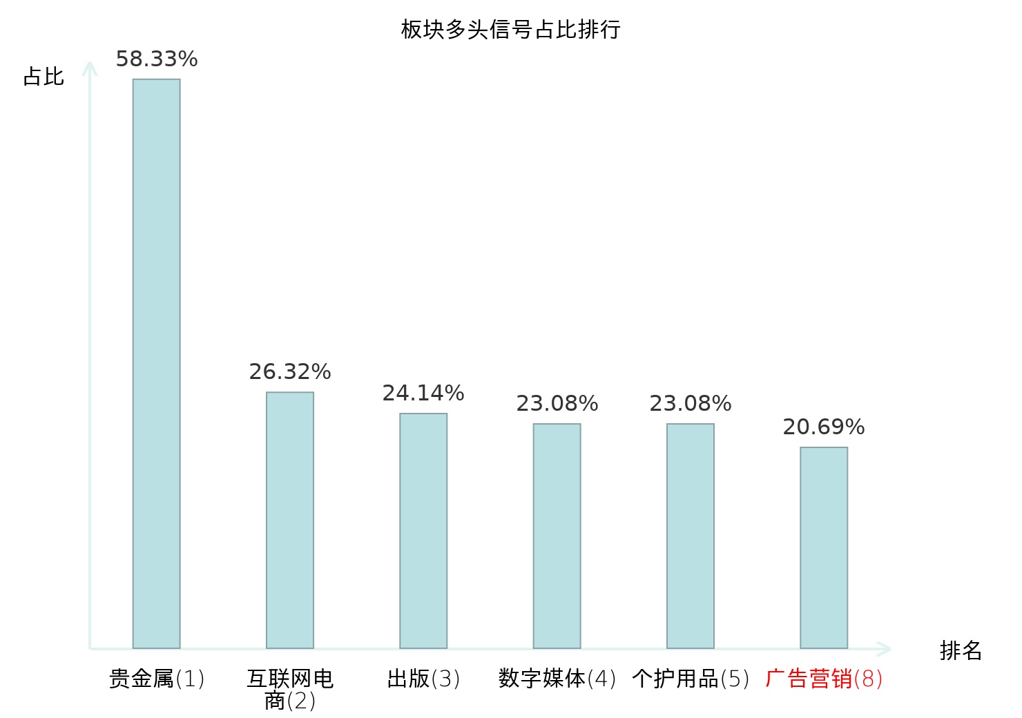 全市场所有行业板块中主力多头信号占比排名中,贵金属板块位居第一。贵金属板块名次提升最快,较昨日上升108位。