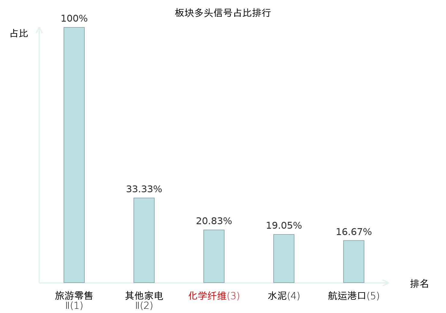 全市场所有行业板块中主力多头信号占比排名中,旅游零售Ⅱ板块位居第一。旅游零售Ⅱ板块名次提升最快,较昨日上升130位。