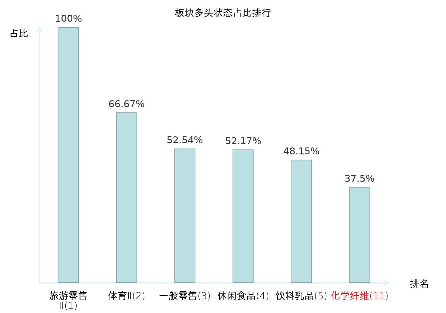 全市场所有行业板块中主力多头状态占比排名中,旅游零售Ⅱ板块位居第一。农业综合Ⅱ板块名次提升最快,较昨日上升109位。
