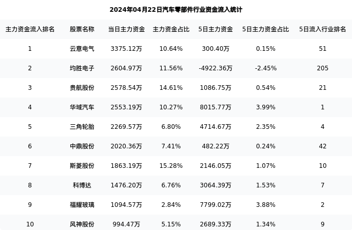 从主力资金流向来看,汽车零部件行业今日主力资金流入61.90亿元,在所有申万二级行业中排名:39/131。