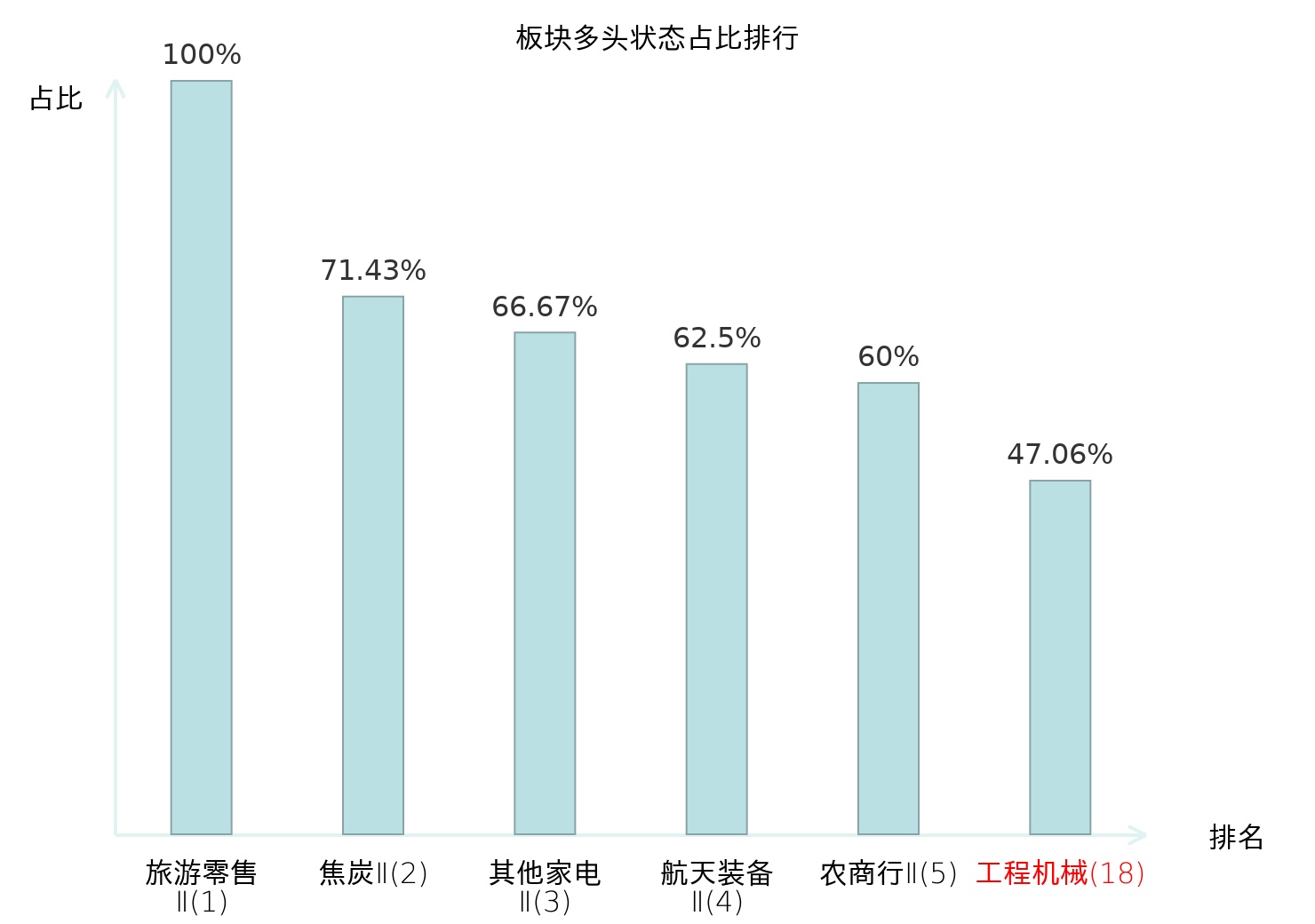 全市场所有行业板块中主力多头状态占比排名中,旅游零售Ⅱ板块位居第一。白酒Ⅱ板块名次提升最快,较昨日上升50位。