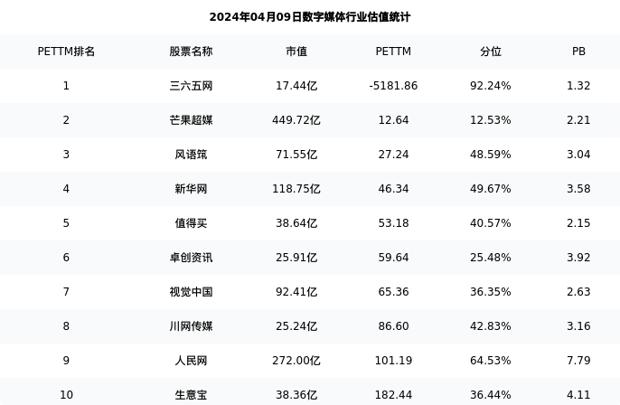 从估值角度看:视觉中国最新市盈率PETTM为65.36,在行业内排名6/13,处于36.35分位。