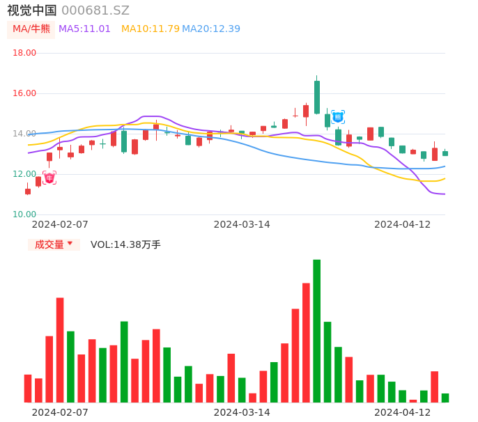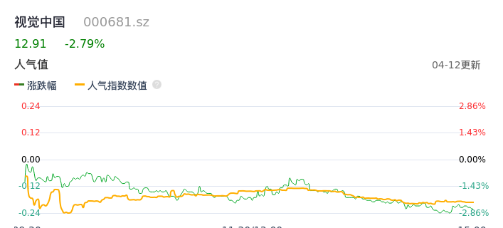 04月12日,视觉中国收报12.91,股价涨幅-2.79%,成交金额1.88亿元,换手率2.13%。