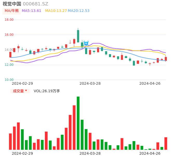 04月26日,视觉中国收报13.02,股价涨幅2.12%,成交金额3.36亿元,换手率3.88%。