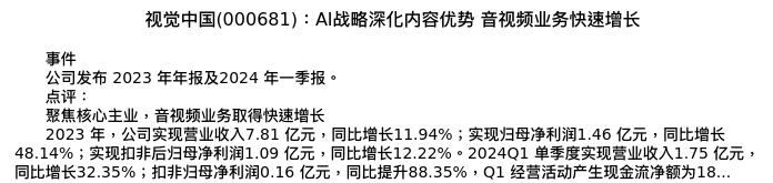 值得注意的是:2024年04月国元证券的李典/路璐分析师,首次发布关于视觉中国的研究报告,标题为:视觉中国(000681):AI战略深化内容优势 音视频业务快速增长。