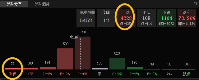 红盘个股4200+,涨停79只,跌停34只,个股中位数涨超1%+,今天4200+的普涨,得益于下午证券+AI应用的带动,但这里量能依旧萎缩明显,超2400亿+,全天仅有1.7万亿的成交,缩量普涨后,注意这里仍有反复的预期。同时要留意晚间美股的走势,强还是弱,也会影响接下来市场是延续反弹还是继续探个底。