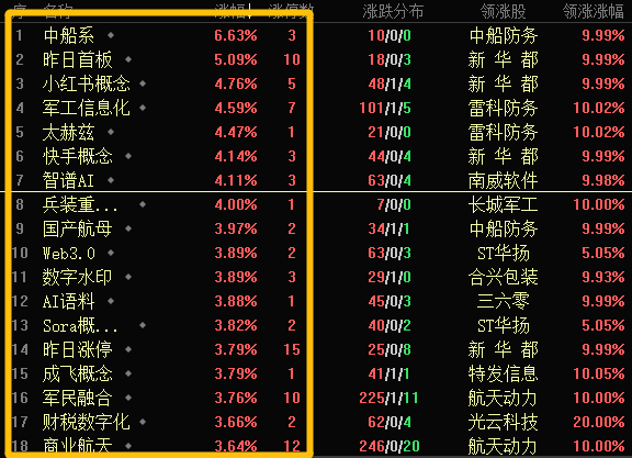 全天表现最强的几个方向,依旧还是中午复盘说的,军工、商业航天、还有AI软件应用方向。
