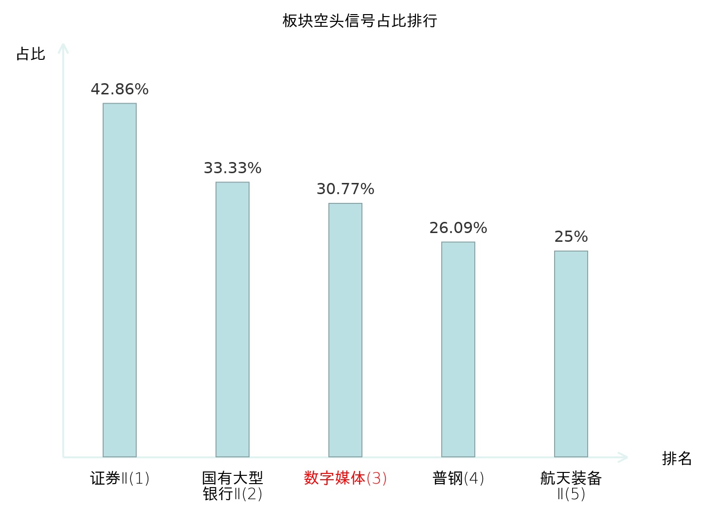 全市场所有行业板块中主力空头信号占比排名中,证券Ⅱ板块位居第一。证券Ⅱ板块名次提升最快,较昨日上升127位。
