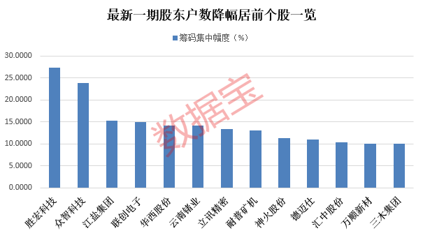 股东户数降幅最多的是胜宏科技,截至最新,股东户数为4.97万户,较7月10日下降27.31%,筹码集中以来该股累计上涨8.71%。
