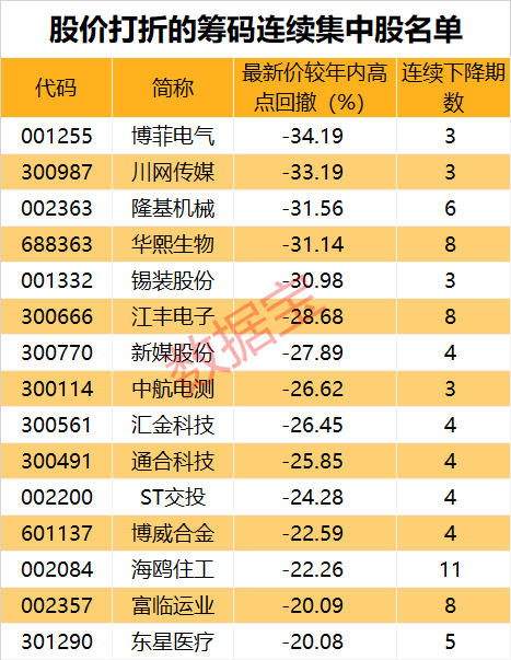 最新筹码集中股出炉,多只筹码连续集中股股价“打折”。