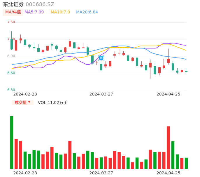 04月25日,东北证券收报6.62,股价涨幅-0.45%,成交金额7318.50万元,换手率0.47%。
