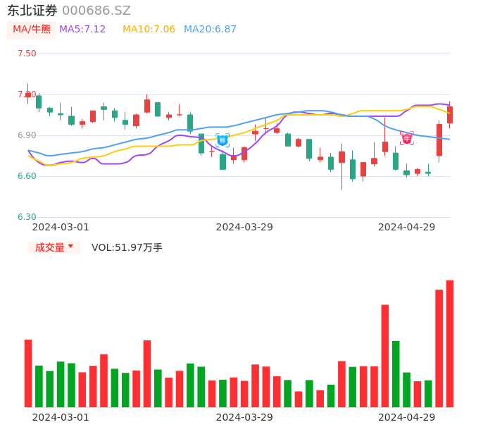 04月29日,东北证券收报7.11,股价涨幅1.86%,成交金额3.67亿元,换手率2.22%。