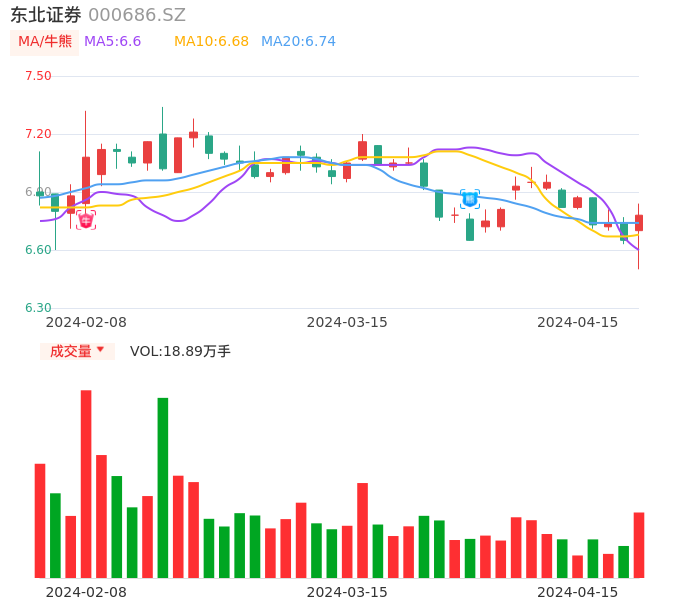 04月15日,东北证券收报6.78,股价涨幅1.95%,成交金额1.27亿元,换手率0.81%。