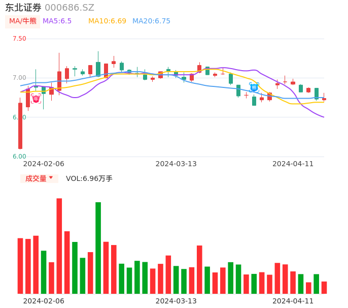 04月11日,东北证券收报6.74,股价涨幅0.15%,成交金额4707.53万元,换手率0.30%。