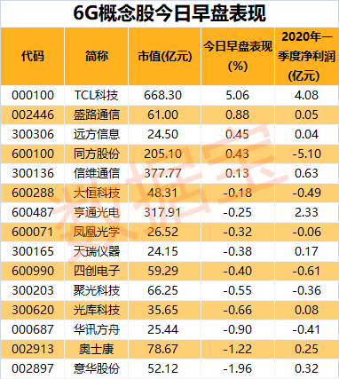 从二级市场表现来看,截至中午收盘,6G相关概念股整体跑赢大盘,在为数不多的15只6G概念股中,半数以上个股呈上涨状态,TCL科技、盛路通信、远方信息、同方股份4股涨幅居前。