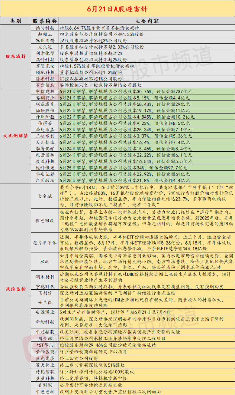 22、中信建投:6月21日解禁,解禁规模占公司总股本30.76%,预估金额737亿元。