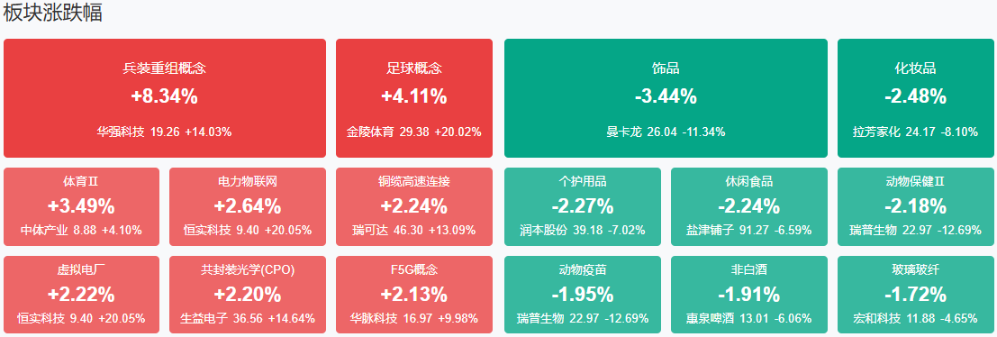 板块方面,足球概念、虚拟电厂、CPO、农药等板块涨幅居前,美容护理、食品、CRO、猪肉等板块跌幅居前。截至收盘,沪指涨0.08%,深成指涨0.16%,创业板指涨0.32%。