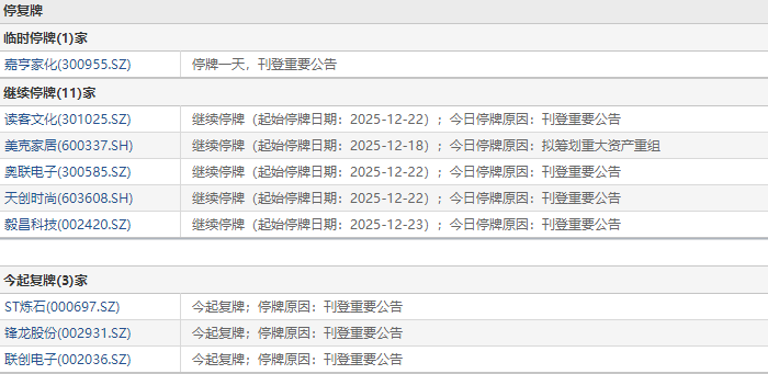12月25日盘前停复牌汇总