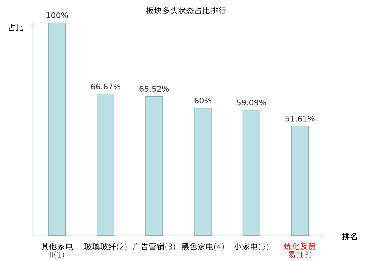 全市场所有行业板块中主力多头状态占比排名中,其他家电Ⅱ板块位居第一。航天装备Ⅱ板块名次提升最快,较昨日上升79位。