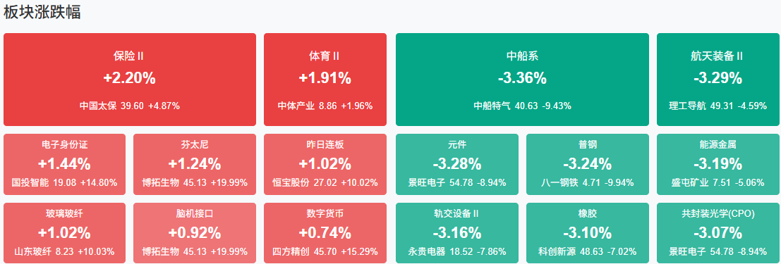 板块方面,保险、脑机接口、数字货币、电机等板块涨幅居前,军工、CPO、铜箔、锂矿等板块跌幅居前。截至收盘,沪指跌0.46%,深成指跌0.87%,创业板指跌1.08%。