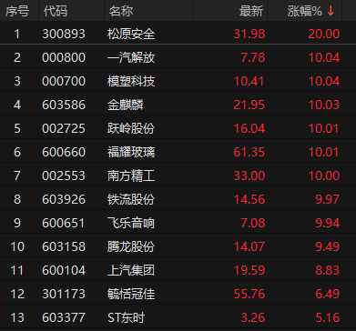 上证报中国证券网讯 8月20日午后,汽车板块震荡走强,截至13时09分,一汽解放涨停,上汽集团、毓恬冠佳等跟涨。此前,松原安全、模塑科技、金麒麟、跃岭股份等多股封板。