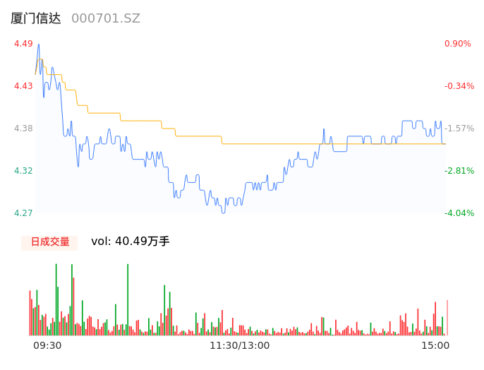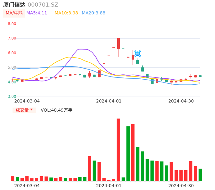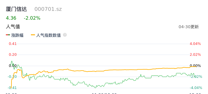 04月30日,厦门信达收报4.36,股价涨幅-2.02%,成交金额1.77亿元,换手率7.78%。