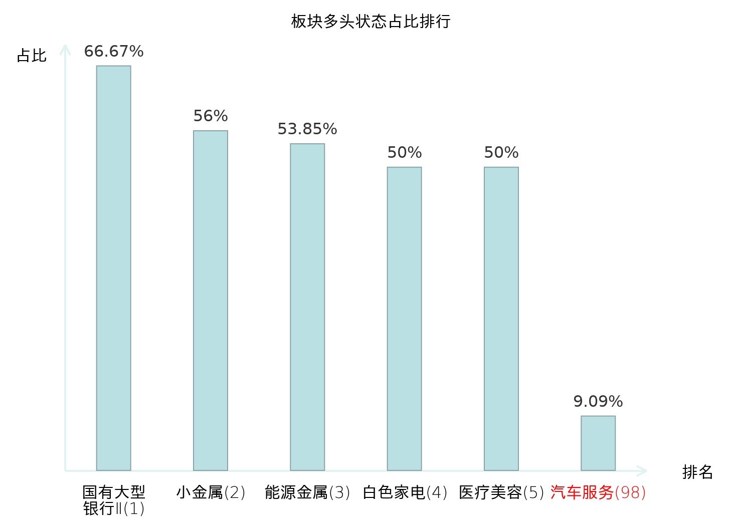 全市场所有行业板块中主力多头状态占比排名中,国有大型银行Ⅱ板块位居第一。酒店餐饮板块名次提升最快,较昨日上升59位。