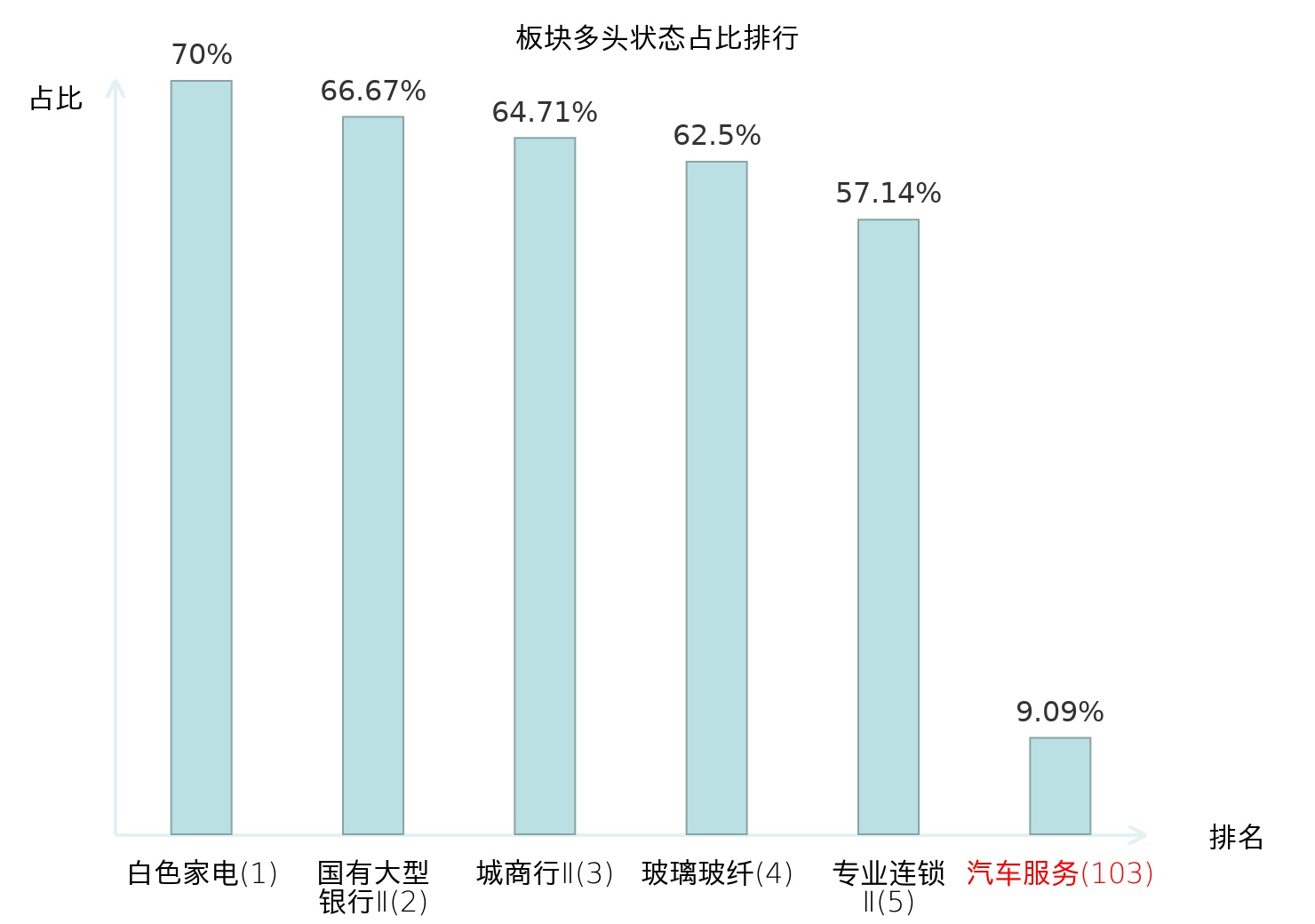 全市场所有行业板块中主力多头状态占比排名中,白色家电板块位居第一。油气开采Ⅱ板块名次提升最快,较昨日上升96位。