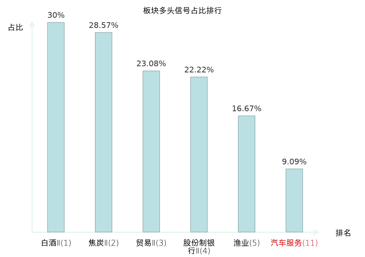 全市场所有行业板块中主力多头信号占比排名中,白酒Ⅱ板块位居第一。焦炭Ⅱ板块名次提升最快,较昨日上升119位。