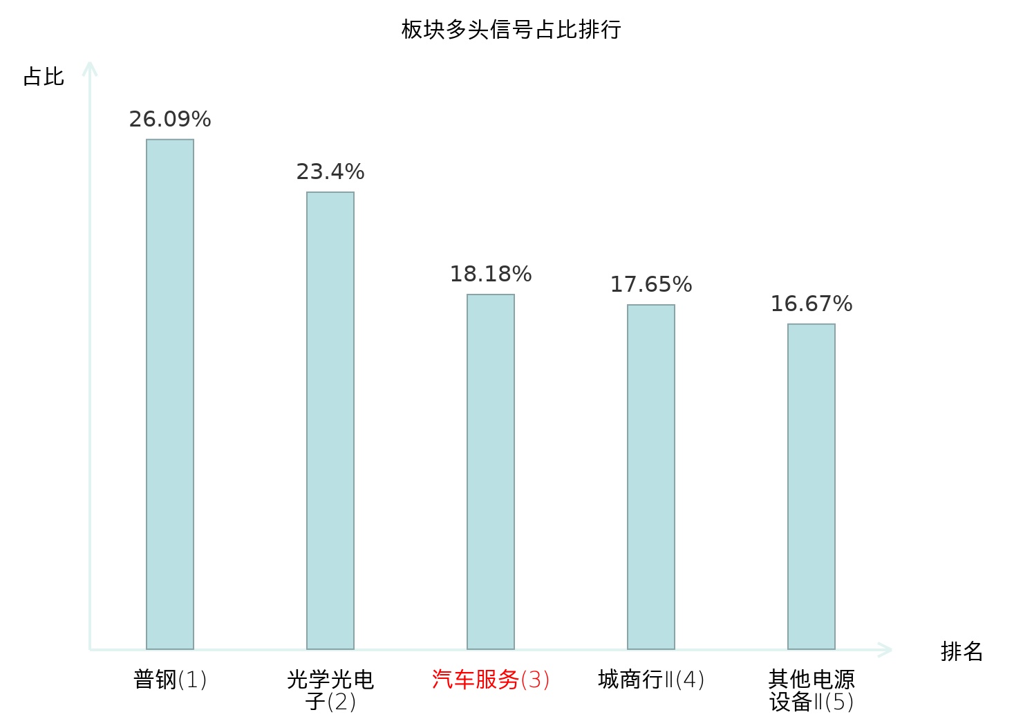 全市场所有行业板块中主力多头信号占比排名中,普钢板块位居第一。国有大型银行Ⅱ板块名次提升最快,较昨日上升116位。