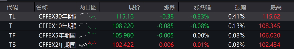 债市多数下跌,30年期主力合约跌0.33%,10年期主力合约跌0.08%,5年期主力合约持平,2年期主力合约涨0.01%。