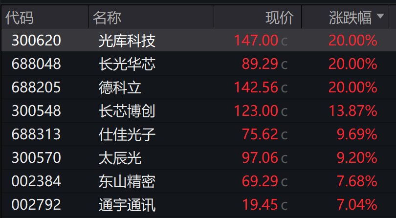 德科立、长光华芯20%涨停,光库科技一度触板,太辰光、长芯博创涨超10%,中际旭创涨近5%。