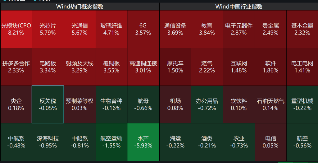 盘面上,个股涨多跌少,沪深京三市约4300股飘红,今日成交逾1.82万亿。板块方面,光通信链条强势领跑,CPO、光芯片、光通信等概念全面爆发,6G、通信设备同步走强,电子元器件、教育等行业指数表现活跃;下跌方面,水产领跌,深海科技、中船系、航空运输等国资及交通类板块普遍承压,农牧、酒类等消费方向亦小幅回落。