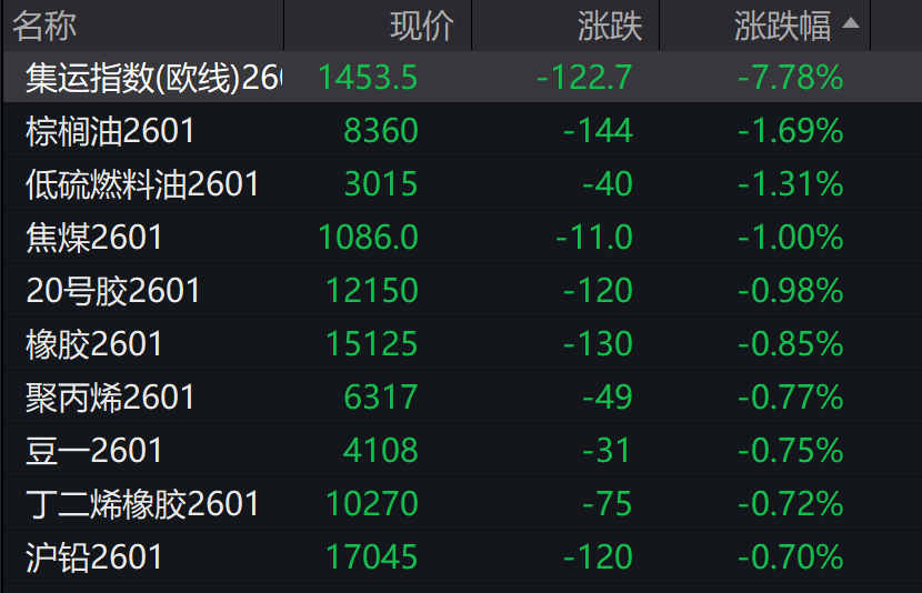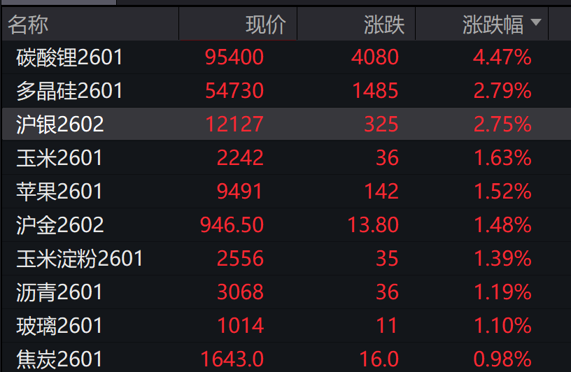 商品多数上涨,碳酸锂涨4.47%,沪银涨2.75%,集运指数(欧线)跌7.78%。