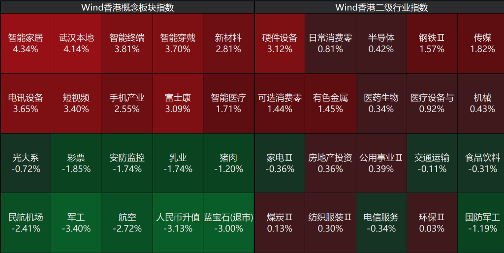 板块方面,今日港股市场呈现"硬科技强、军工弱"的鲜明对比,智能家居产业链在消费复苏预期下获得资金追捧,硬件设备与半导体板块的联动上涨反映市场对科技硬件景气度回升的乐观预期。军工与航空板块调整或受地缘情绪波动影响,人民币升值受益板块走弱显示市场对汇率敏感型资产偏好下降。整体看,市场风格明显转向内需消费与硬科技制造双主线。